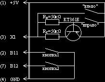 (буквенный индекс, в принципе, не важен) и два резистора по 50-100 кОм. В нормальном состоянии транзистор открыт и ток легко протекает и через базовый и через коллекторный резисторы, поэтому общее сопротивление примерно равно Rb*Rc/(Rb+Rc) - старая школьная формула. Когда нажимают кнопку "вправо" ("вниз", "тормоз"), на базу подается запирающее смещение и ток через коллекторный резистор больше не течет - сопротивление становится примерно равно Rb. Когда нажимают кнопку "влево" (и пр.), сопротивление, очевидно, становится равным 0. Таким образом, если использовать одинаковые резисторы, получаем три градации сопротивления на каждой оси (0, R/2 и R). |